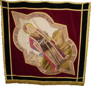 1882 konnte die Bruderschaft erstmals eine gestickte Fahne ihr Eigen nennen. Diese sogenannte „Stickfahne“ ist aufwendig – in rotem Samt mit grünem Randstreifen ebenfalls aus Samt, jeweils mit Goldtressenband eingefasst – gestaltet und besteht aus zwei unterschiedlichen und aufeinander genähten Fahnentüchern (Doppeltuchfahnen), die jeweils mit unterschiedlichen Randmotiven reichlich bestickt sind.