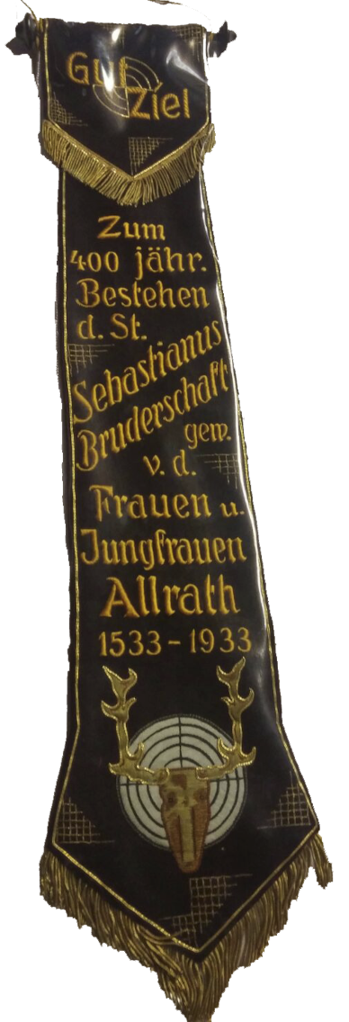 Dieser Fahnenwimpel wurde im Jahre 1933, anlässlich des 400-jährigen Vereinsjubiläums der Sankt Sebastianus Bruderschaft 1533 e.V. von den ‚Frauen und Jungfrauen‘ gestiftet. Hierbei ist die katholische Frauengemeinschaft (ehem. Kfd) des Ortes gemeint, die damals schon zum überwiegenden Teil auch die Mitgliedschaft, erworben zum überwiegenden Teil durch Heirat mit einem Mitglied der Bruderschaft, in der örtlichen Sebastianus Bruderschaft besaßen.