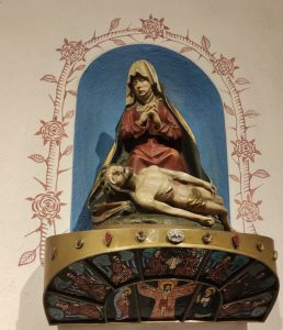 Im oberen mittleren Hintergrund wird die Mutter Gottes mit dem Jesuskind auf dem Schoß dargestellt; in Anlehnung an die ursprüngliche Namensgebung der Bruderschaft „Zu Ehren der hl. Mutter Gottes und des hl. Sebastianus“.