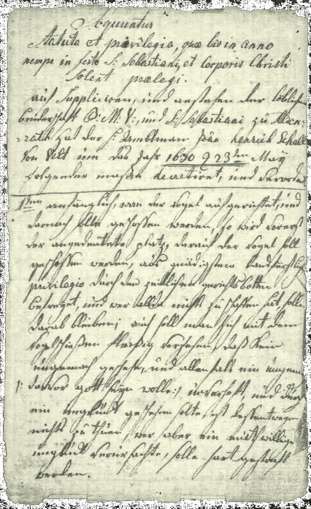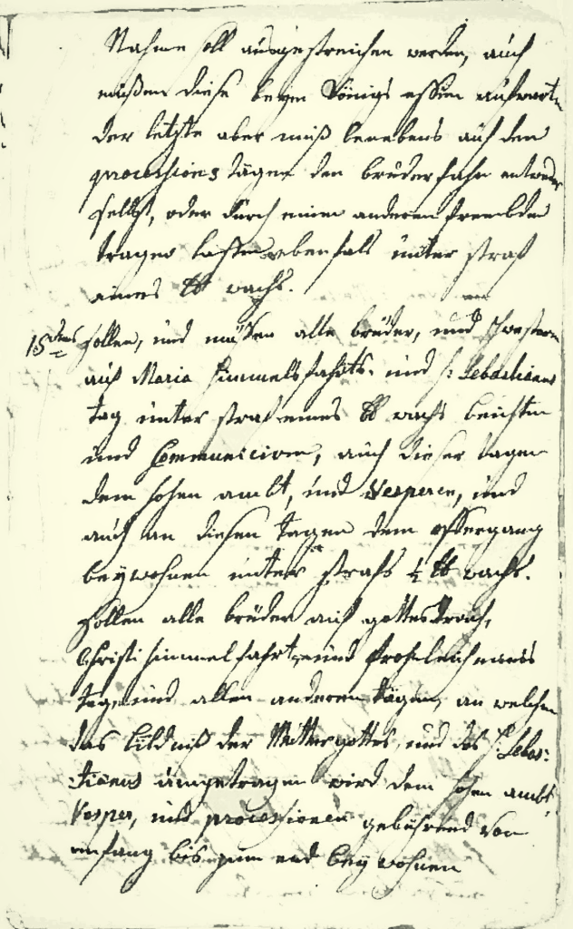 (15) Sollen und müßten alle Brüder und Schwestern auf Maria Himmelahrts- uns San Sebastianustag unter straf eines Pfund Wachs beichten und communiciren, auch dieser tagen dem hohen ambt und Vesperen und auch an diesn Tagen dem ostergang beywohnen unter Straf ½ Pfund Wachs. Auch sollen alle Brüder auf gottestach (Anm.: Sonntag), christihimmelfahrt und fronleichnamstag und allen anderen Tägen, an welchen das Bildnis der Muttergottes und des hl. Sebastianuns umgetragen wird, dem hohen ambt, Vesper und processionen gebührend von anfang bis zum end beywohnen oder wegen Krankheit, alterthum oder sonstigen gescheften excusiren (Anm.: sich entschuldigen) unter straf eines Pfund Wachs; die aber muthwillig ausbleiben, sollen ausgestrichen werden.
