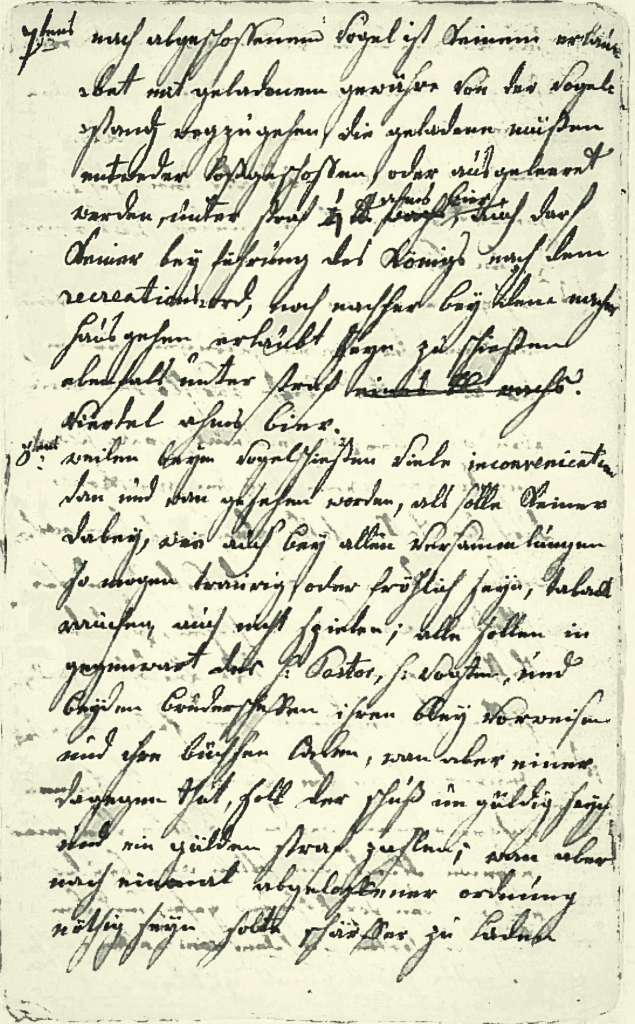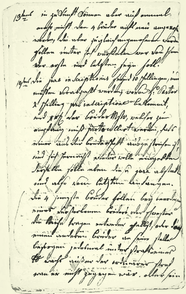 (12) Aus demselben Haus sollen nicht mehr dran einer angenohmen werden, jedennoch können die Bruderschaften mit Bewilligung der übrigen Brüderen darin dispensiren, wan sie der Bruderschaft wie sonst gewöhnlich eine recreation (Anm.: gemeinsames Essen) geben. Ein gleiches ist auch von den junggesellen zu verstehen.