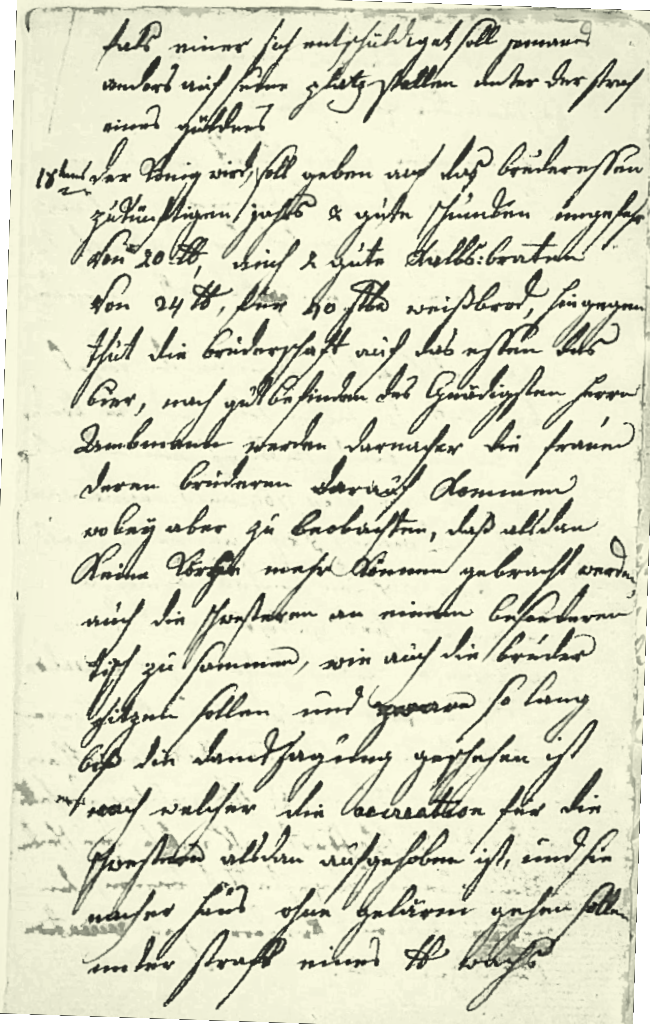(18) Der (Anm.: wer) König wird, soll geben auf das Bruderessen zukünftigen jahrs 2 gute Schinken ungfehr von 20 Pfund auch 2 gute Kalbsbraten von 234 Pfund, für 24 Albus weißbrod, hingegen thut die Bruderschaft auf das essen das bier; nach gut befinden des Gnädigsten Herren Ambmann werden darnacher die frauen deren Brüderen darauf kommen, wobey aber zu beobachten, daß alsdan keine Körbe mit Trunk und Essen mehr könne gebracht werden, auch die Schwestern an einem besonderen Tisch zusammen, wie auch die Brüder sitzen sollen und zwar so lang biß die Danksagung geschehen ist und sie nachher Haus ohne gelaerm gehen sollen unter straf eines Pfund Wachs. Die Brüder hingegen können noch bis zur bestimmten zeit bleiben.