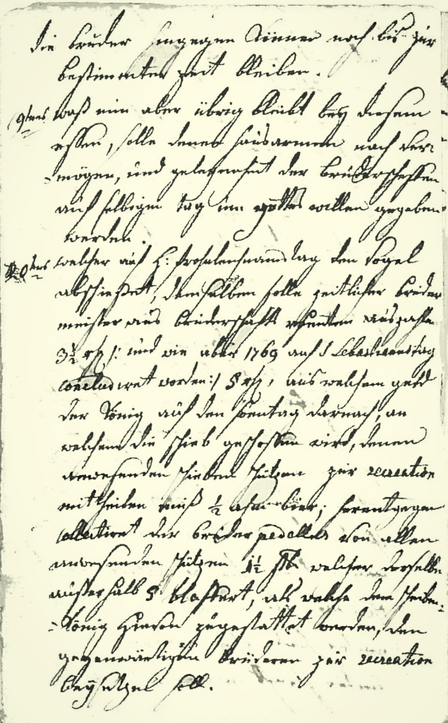 (13) In Zukunft können aber auf einmal mehr nicht dan 4 Brüder aufs neu genohmen werden; die aber zugleich angenohmen werden, sollen unter sich würfeln, wer von ihnen der erste und der letzte sey solle.