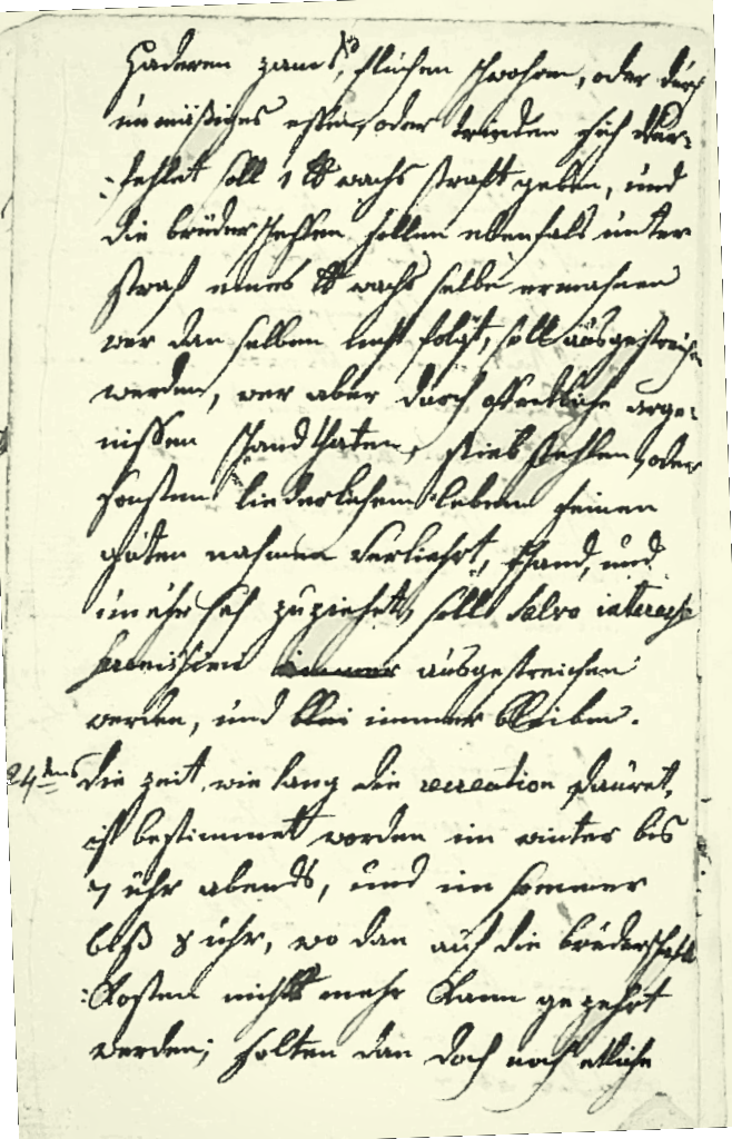 (24) Die zeit, wie lang die recreation dauert, ist bestimmt worden im winter bis 7 uhr abends und im Sommer bis 8 uhr, wo dan auf die Bruderschafts-Kosten nichts mehr gezehret werden; sollten dn doch noch etliche Brüder für ihr eigenes geld zehren wollen und sich hernachs mit streitigkeit und zanken oder sonsten unehrbahr verhalten, sollen sie darnach ein Pfund wachs straf zahlen.