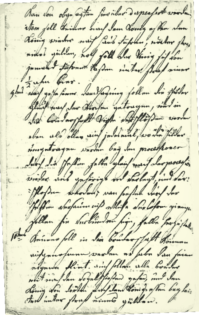 (21) Ferners hat der König aus gnädigstem privilegio unseres Landesfürstens 4 morgen in der steuer frey und hat sonsten keine auszahlung mehr, als daß er den 4ten Sontag nach ostern vor unserer ordinären procession einsilbernes Schild, ungefehr von 12 Schillingen mit sach und ambtsprob (mit sachlich richtigem Amtsnachweis) zu den anderen Schildern anhangen muß; bis dessen ausbleibungsfall soll er nicht fähig seyn, die Schilder umzutragen.