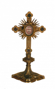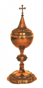 Das Ziborium besteht aus Silber und Kupfer und wurde im Jahre 1685 anläßlich der jährlichen ‚Rhenten‘ – Zahlungen (Zins- / Pachteinnahmen der Bruderschaft) der Mitglieder der Sankt Sebastianus Bruderschaft angefertigt. Der Kirchengemeinde St. Matthäus wurde das Ziborium überreicht als äußeres Zeichen des Wohlstandes, als Zeichen des Glaubens und aus Dankbarkeit der 1533 e.V. gegründeten Bruderschaft. Die Sankt Sebastianus Bruderschaft Allrath verfügte in diesen Jahren –ca. 150 Jahre nach ihrer Gründung- bereits über ein beträchtliches Vermögen an Gold und Silber, sowie an großen Ländereien, die an die Mitglieder der Bruderschaft verpachtet werden konnten.
