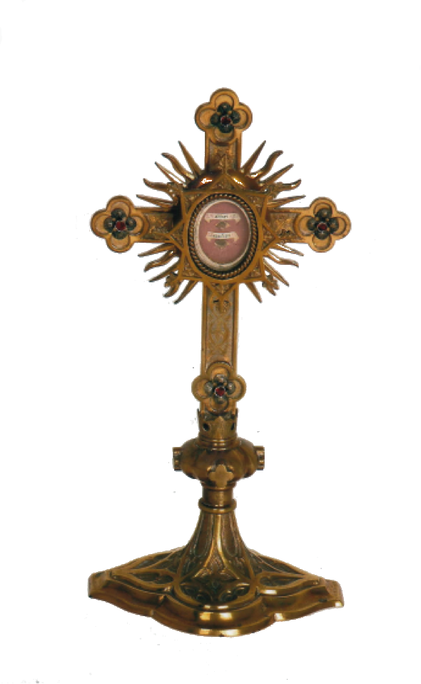 Das Tischkreuz besteht ebenso wie das Ziborium aus Silber und Kupfer und wurde –sehr wahrscheinlich- ebenfalls im Jahre 1685 durch den gleichen Goldschmied angefertigt, der auch das Ziborium angefertigt hat. Die Machart, die Art der Verzierungen (Ziborium und Tischkreuz) und auch die Gravur auf dem Ziborium im Vergleich zum eingearbeiteten Schriftzug sind nahezu identisch, deshalb liegt die Vermutung nahe und lässt den berechtigten Schluss zu, dass dieses Tischkreuz und das Ziborium Bestandteil der Schenkung im Jahre 1685 an die Kirchengemeinde St. Matthäus Allrath waren.
